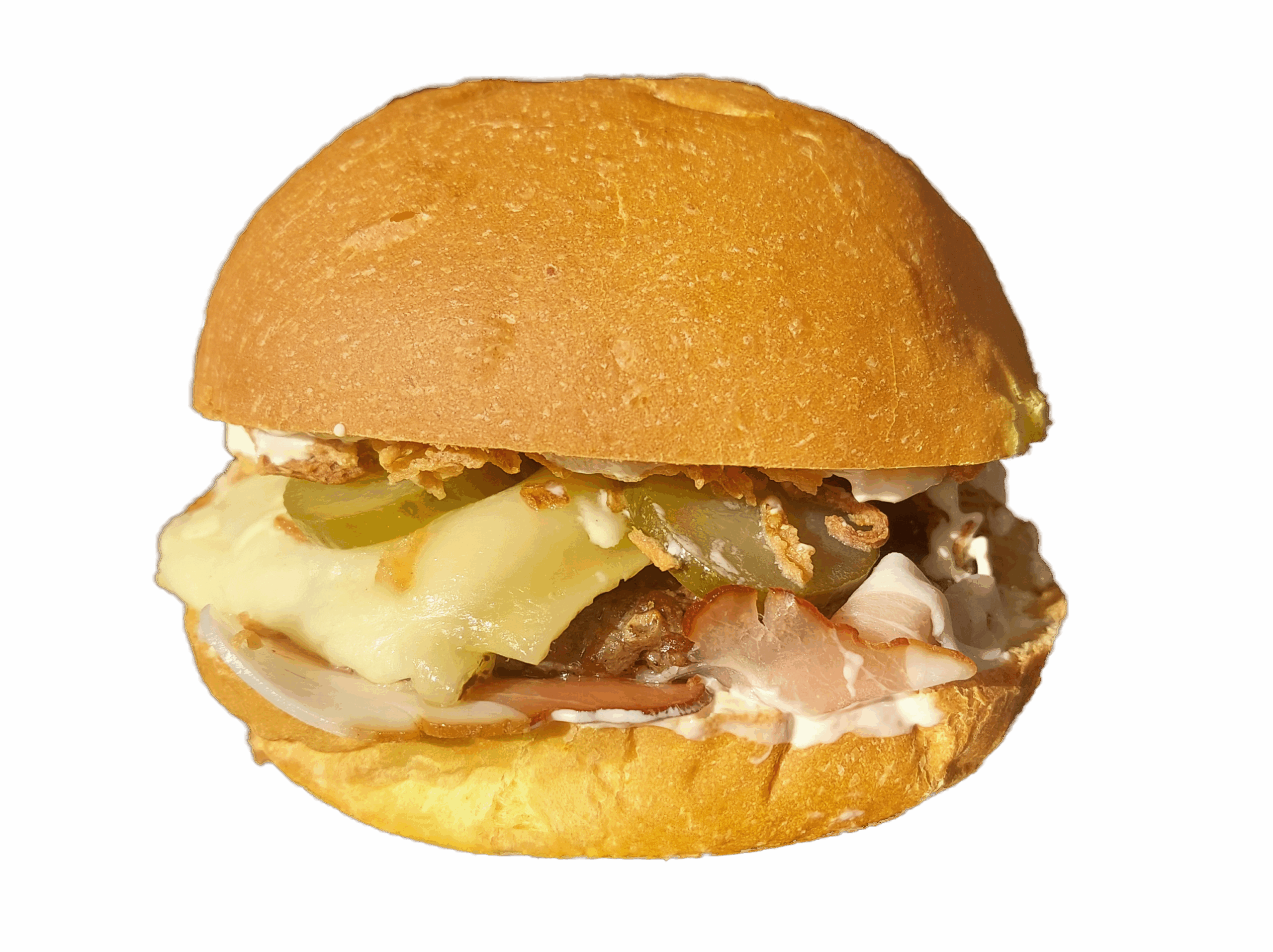 Steak haché de boeuf 140g, raclette fermière d’Alsace au lait cru, pickles de cornichons, oignons frits, jambon cru de la forêt noire, sauce crémeuse à l’échalotte